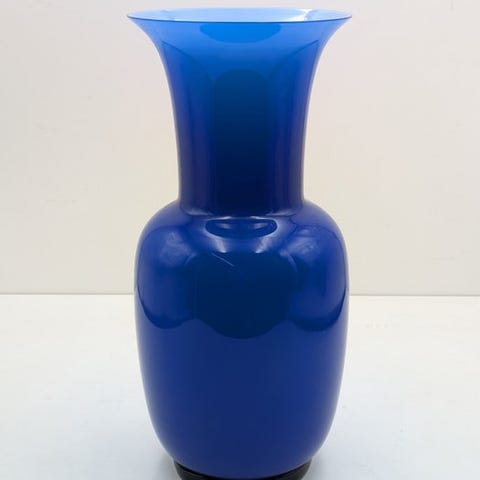 Vasen er fremstillet med den traditionelle Murano-teknik og har et bluino-ydre, en dyb og raffineret blå nuance, der står i kontrast til den rene hvide farve på det opalinfarvede indre. Dette farvespil fremhæver ikke kun vasens rene linjer og grundlæggende form, men skaber også en slående visuel effekt.