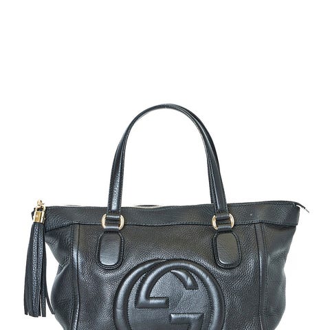 Detaljer og dele i gyldent metal, samt vedhæng med det sammenflettede GG-logo, der identificerer modehuset.