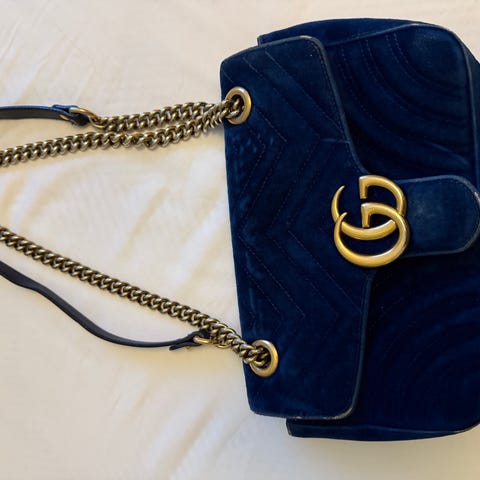 Gucci blå læder skuldertaske, én størrelse, med aftagelig skulderrem og blå læderforing, prydet med blå-rød-blå web og gyldent GG-logo horsebit, i god stand med let brugsspor. Klik på den blå "gå til varen" knap, for at købe eller byde på denne vare. Den samlede pris vil blive vist inden du afgiver dit bud.