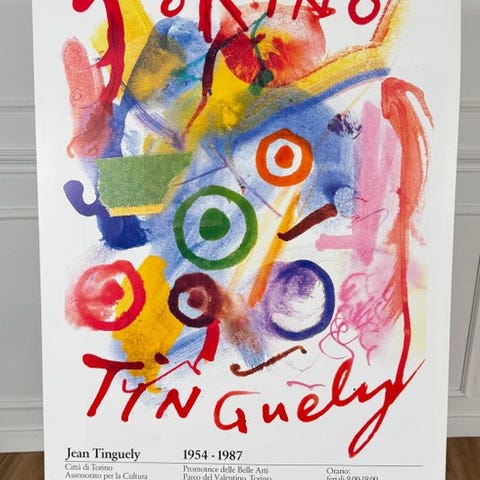 Eksplosiv og gestuel komposition, bygget som en visuel mekanisme i konstant bevægelse. Farverige cirkler, nervøse tegn og farveskygger væves sammen i en struktur, der tilsyneladende virker kaotisk men stærkt rytmisk, og henviser til billedverdenen af maskiner og mekanismer, som er typiske for Tinguelys forskning. Det sorte tegn, hurtigt og skarpt, fungerer som en slags ramme, der holder sammen energi, ironi og kontrolleret uorden.
