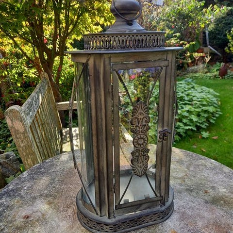 Dette er et meget smukt par lanterner. En smuk gylden farve, og det ser meget flot ud, når der brænder et tykt lys.