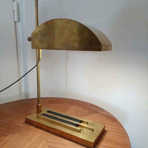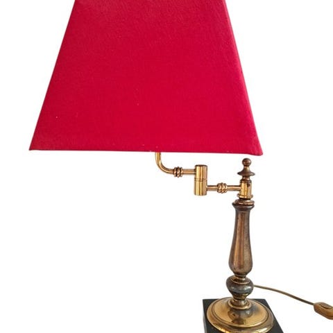 Vintage bordlampe i Hollywood Regency stil med ophæng i onyx-marmors fod og messingdetaljer, elektrisk (E27, 230 V, op til 60 W), ca. 50 cm høj og 30 cm bred, oprindelse Europa, dateret 1970–1980, i god brugt stand med let tegn på alder. Klik på den blå "gå til varen" knap, for at købe eller byde på denne vare. Den samlede pris vil blive vist inden du afgiver dit bud.