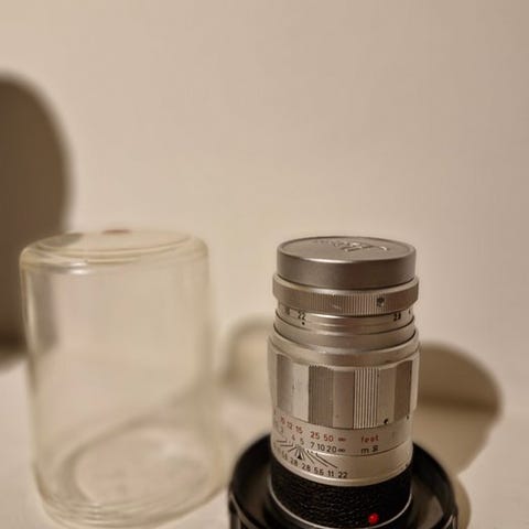 En brugt Leica Leitz Canada ELMARIT M 90mm f/2.8 fra 1958. Der er tydelige tegn på tidligere brug, her og der lidt støv, minimale ridser hvis man kigger rigtig godt efter med et forstørrelsesglas. Et sjovt portrætobjektiv.