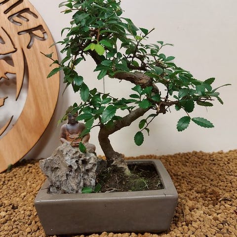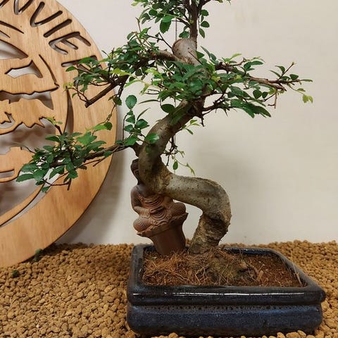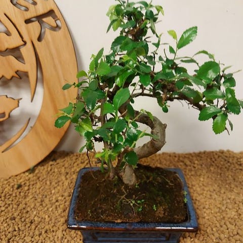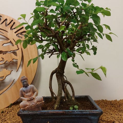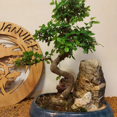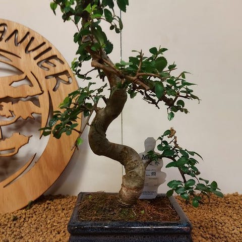 De Zelkova bonsai, også kaldet Japanse iep, udstråler ro og elegance. Med sine fine grene, takkede blade og elegante form er den et symbol på balance og naturlig skønhed. Denne stærke og elegante træ ændrer sig med årstidernes skiften, fra friskgrønt om foråret til varmt gyldent om efteråret.