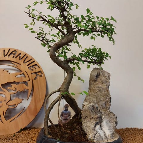 Denne bonsai er et symbol på stabilitet og indre ro. Dens langsomme vækst og rolige form gør den til en fredelig følgesvend i en verden fuld af travlhed.