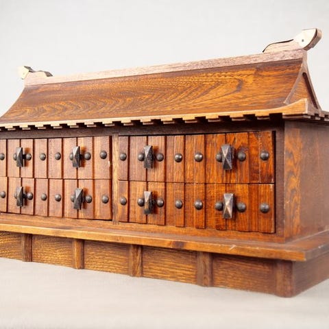 Et japansk antikt skriveboks (suzuribako) med maki-e i guld og sort, Kara-shishi og peoni, inklusive blæksten og vanddråber, dateret 1900–1910, vægt ca. 1200 g, mål 24,4 × 21,3 × 4,6 cm, i god stand med aldersrelaterede tegn. Klik på den blå "gå til varen" knap, for at købe eller byde på denne vare. Den samlede pris vil blive vist inden du afgiver dit bud.