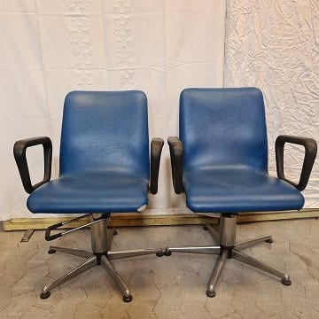 Par barberstole i vintagestil fra 1950’erne, lavet af stål med læderbetræk, oprindelse Italien, dimensioner 100 cm høje, 60 cm brede og 130 cm dybe, estimeret periode 1940–1950, i meget dårlig stand med omfattende sprækker, skader eller manglende dele. Klik på den blå "gå til varen" knap, for at købe eller byde på denne vare. Den samlede pris vil blive vist inden du afgiver dit bud.