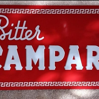 Vetrofania reklame for Campari Soda produceret af A.G. Grossi – Milano i 1950'erne. Størrelse ca. 18 x 10 cm. Fremstillet i glas med originalt metalkant, en karakteristisk kendetegn ved produktionerne fra den tid.