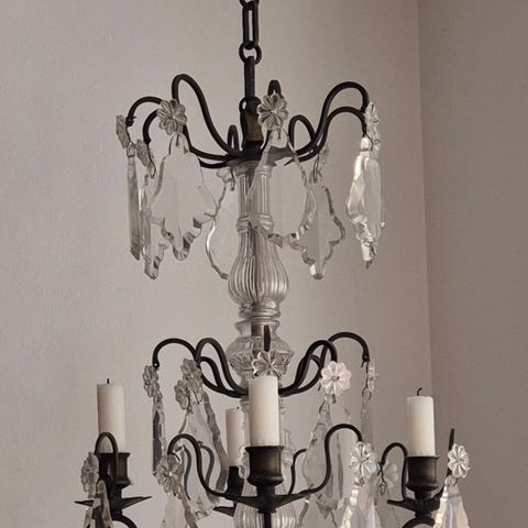 Hermed sælger vi en antik lysekron, sandsynligvis i Empire-stilen fra det sene 19. århundrede fra Frankrig. Lysekronen og krystallerne er i god stand og vil, efter nærmere aftale, blive rengjort eller ikke rengjort ved overdragelsen. Afhentning er i Frankfurt, da lysekronen vejer meget.
