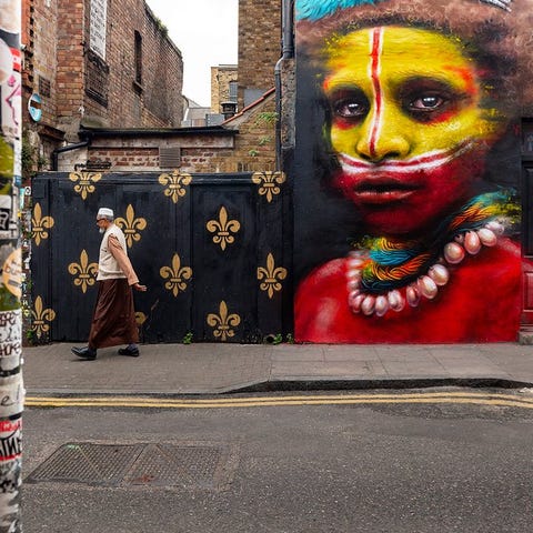 Neonskilte, graffiti og vægge fortæller historier om pulserende liv, den menneskelige tilstedeværelse er reduceret til det essentielle, hvilket antyder en intens forbindelse med miljøet.