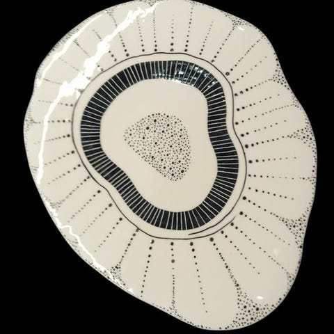 Dette rektangulære keramiske fad præsenterer en afbalanceret modernistisk komposition udført i sorte, røde og cremeglasurer. Overfladen rummer en stiliseret figurativ og symbolsk scene fremstillet med sikker lineær penselføring, der kombinerer abstrakte former med figurative referencer. Det afdæmpede farvevalg og grafiske tydelighed giver værket en stærk visuel tilstedeværelse, der gør det velegnet til vægudstilling eller