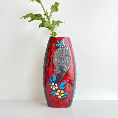 Italiensk keramikvase, signeret Simone – Desimone Italy, fra 1960’erne, glasurkeramik med håndmalet motiv af et stiliseret kvindeligt ansigt omgivet af blomster, højde 29 cm, diameter 13,5 cm, i god stand med visse slidspor forårsaget af alder. Klik på den blå "gå til varen" knap, for at købe eller byde på denne vare. Den samlede pris vil blive vist inden du afgiver dit bud.