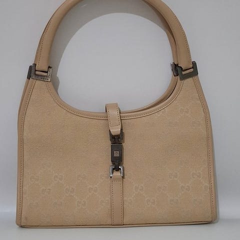 Gucci Jackie GGCanvas beige håndtaske i læder med Minkfarvet ruskind og forgyldt metal, en størrelse, 25 cm høj, 31 cm bred, 11 cm dyb, monogram mønster, i god stand med enkelte brugsspor. Klik på den blå "gå til varen" knap, for at købe eller byde på denne vare. Den samlede pris vil blive vist inden du afgiver dit bud.
