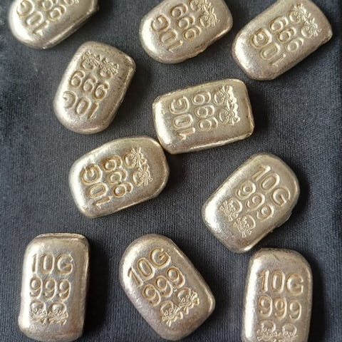 Ni 10 gram støbte sølvbarer, samlet vægt 90 g, 999-fine sølv, fra USA Atlantis Mint Skull Bones. Klik på den blå "gå til varen" knap, for at købe eller byde på denne vare. Den samlede pris vil blive vist inden du afgiver dit bud.