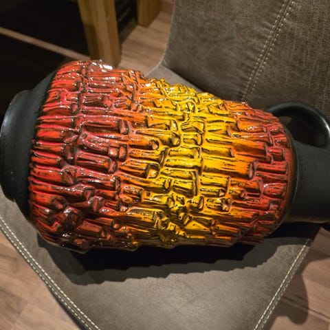 Carstens Atelier Cordoba vase af Heinz Siery til Carstens Tönnieshof, Vesttyskland, model C.875-26, 26 cm høj, 20 cm i diameter, cirka 1967, i fremragende vintage stand uden chips eller revner, Cordoba-dekor med mørkeblå glaseret glasur, rød bælte og taupe streger med bronze iriserende glitter. Klik på den blå "gå til varen" knap, for at købe eller byde på denne vare. Den samlede pris vil blive vist inden du afgiver dit bud.