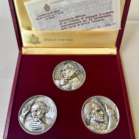 Sæt af 5 sølvmønter fra Italien i fremragende stand, samlet sølvvægt 210 g, herunder én 60 mm medaljon til minde om Mediterranean Games 1997 (sølv 986, 110 g) fra Istituto Poligrafico e Zecca dello Stato, to 40 mm commemorative til IX århundrededagen for San Nicola-translitteration (sølv 986, 40 g hver) fra Istituto Poligrafico e Zecca dello Stato, og to Bari julemønter (sølv 800, 10 g hver) fra Comune di Bari. Klik på den blå "gå til varen" knap, for at købe eller byde på denne vare. Den samlede pris vil blive vist inden du afgiver dit bud.