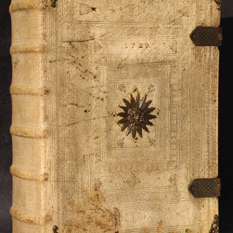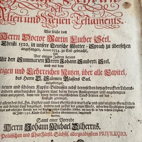 De tilbyder en meget smuk bibeludgave fra forlaget Johann Rudolph og Ludwig König (Frankfurt) fra 1678. Indbundet i en blindpræget svineskindsindbinding fra tiden, trukket over trædæksler med 10 dekorerede beslag og 2 boglåse.