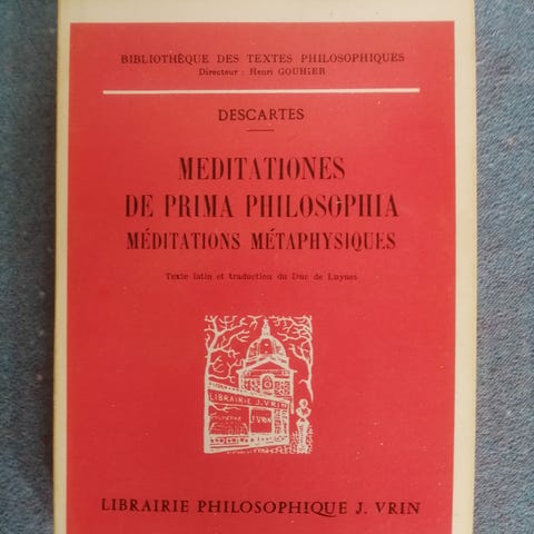 René Descartes' Meditationes de prima philosophia, hvori Guds eksistens og den menneskelige sjæls adskillelse fra legemet demonstreres. Hertil er vedlagt forskellige indvendinger fra lærdedør, mod disse demonstrationer af Gud og sjælen; med forfatterens svar. Den sidste udgave større og mere gennemarbejdet end tidligere. Amsterdam: hos Daniel Elzevirium, 1670. Værket er i den sjældne Elzeviri-udgave opdelt i to dele, hver med frontispice. Den anden del bør indeholde fem kapitler (som frontispice angiver), hver med sin egen behandling; her mangler den sidste, nemlig “Epistola ad Gisbertium Boetium”. Som helhed er ellers værket komplet. Titlen på den anden