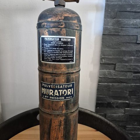 Kobber sprøjte fra 1960’erne, designet af Murratori-France og produceret af Muratori-Paris-France i Frankrig, i fremragende stand med minimale slidmærker, vintage industriel design, mål 35 cm høj, 18 cm dyb og 10 cm bred. Klik på den blå "gå til varen" knap, for at købe eller byde på denne vare. Den samlede pris vil blive vist inden du afgiver dit bud.
