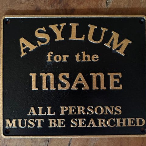 Støbt jern reproduktionsskilt med titlen „Asylum For The Insane“ fra Europa, i nyskick, måler 27 cm i højden og 13 cm i bredden. Klik på den blå "gå til varen" knap, for at købe eller byde på denne vare. Den samlede pris vil blive vist inden du afgiver dit bud.
