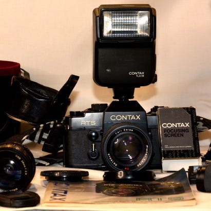 Dette sæt inkluderer et Exakta Varex kamera fremstillet af Ihagee i Dresden. Det ledsages af to objektiver: et P. Angenieux Paris 1:3.5 og et Carl Zeiss Jena 2.8/50.