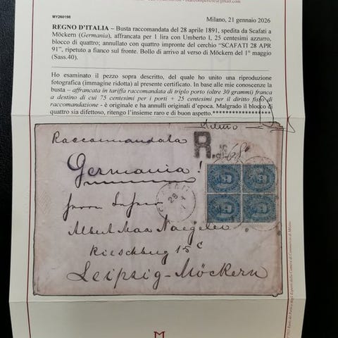 Forsikret brev fra Brindisi til Napoli frankeret for 70 cent, tredobbelt indlandsporto med ret til anbefalet levering med 3 stykker af 20 cent med tandning og 1 stykke af 10 cent med tandning.