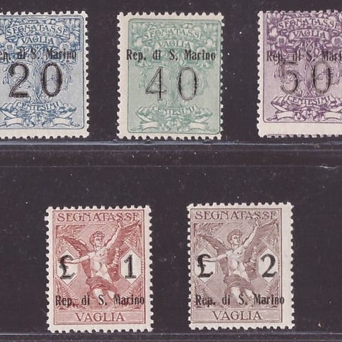 San Marino Segnatasse overtryk, 7 værdier; fortrinlig, meget frisk kvartetten, Ny uden gum, Sassone T 47/53 (1936). Klik på den blå "gå til varen" knap, for at købe eller byde på denne vare. Den samlede pris vil blive vist inden du afgiver dit bud.