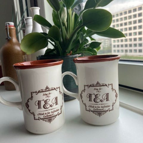 Gul keramisk kop med hank, højde cirka 11 cm. Koppen har en konisk form med hvid inderside og blå kant. Velegnet til servering af varme drikke.