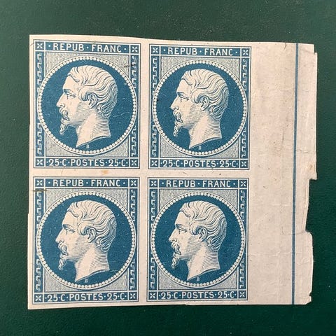 Frankrig, 25 øre Sage type II i fireblok, ubrugt, fra 1879, katalogopførsel Yvert 92, øverste frimærke med repareret perforering. Klik på den blå "gå til varen" knap, for at købe eller byde på denne vare. Den samlede pris vil blive vist inden du afgiver dit bud.
