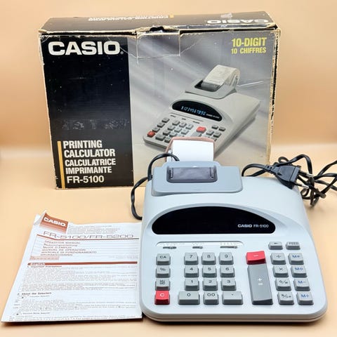 Sæt med 3 vintage Casio FX-850P, HP-20S og HP-10B kalkulatorer i god brugstilstand, hver cirka 20 cm i bredde, højde og dybde, fra 1990–2000. Klik på den blå "gå til varen" knap, for at købe eller byde på denne vare. Den samlede pris vil blive vist inden du afgiver dit bud.