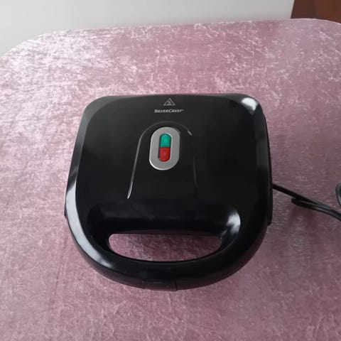 Det er et robust og funktionelt husholdningsapparat, brugt men fuldt operationelt: håndtaget, ristningsindstillingen og STOP-knappen fungerer korrekt.