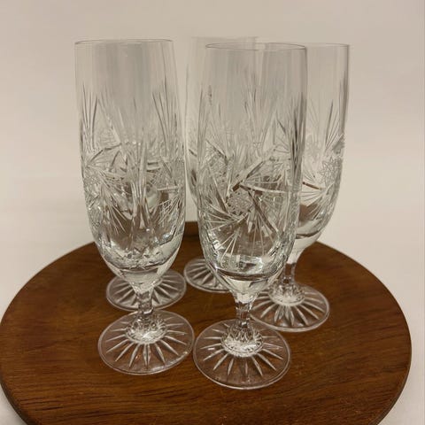 Set af 6 champagneglas, fremstillet af glas/kristal, tilskrevet portugisisk fremstilling, Marinha Grande, det 20. århundrede.