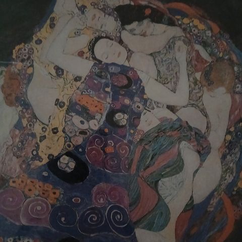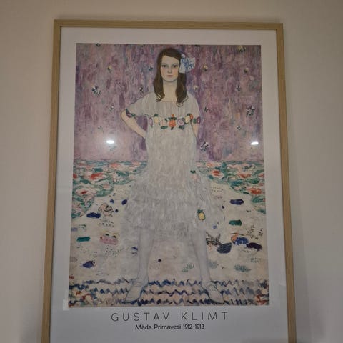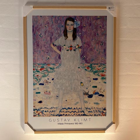 - Gustav Klimt (efter), offsetlitografi på tykt, mat tekstureret papir (ca. 300 g/m² - refererer til papirtykkelse/tæthed).