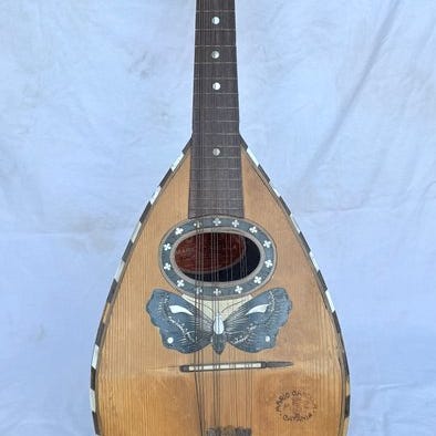 Paletten har en udskåret form, typisk for mange antikke mandoliner, med stemmeskruer til stemning.