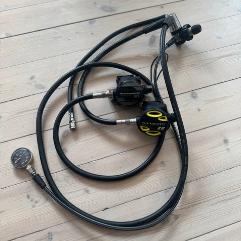 Der indgår højtryks manometer der er monteret i et konsol med plads til endnu et instrument fx. kompas/dykkercomputer eller dybdemåler. Desuden indgår feder slange til opstigningsvest / tørdragt - i sættet.