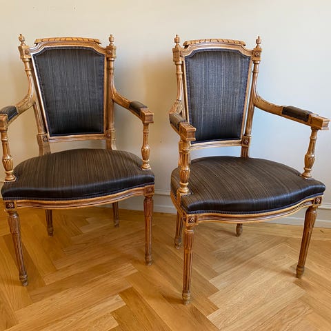 Stolene er i meget god stand og det samme er møbelstoffet der er velholdt med farverne i behold.