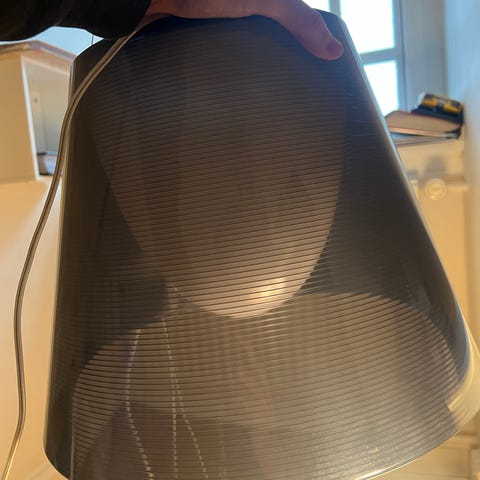 Flos Ktribe S3 af Phillippe Starck er en del af Flos mest sælgende serie som består af pendler, standerlamper, bord og væglamper. Pendlen er udført i delvist transparent polycarbonat med indvendig skærm i opalliseret glas. Dette giver en super god belysning og afskærmning af pæren så man ikke blændes.