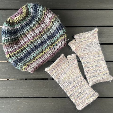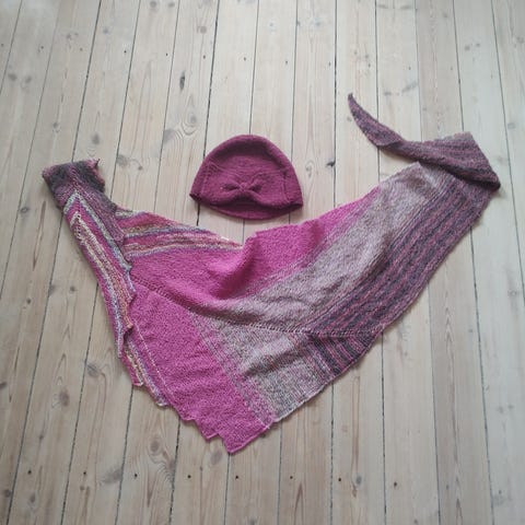 Håndstrikket sæt med hue og halsvarmer i flot mønster med retstrik og snoninger. Garnet er uld/polyester som er dejlig lunt og ikke kradser.