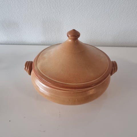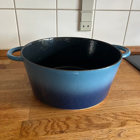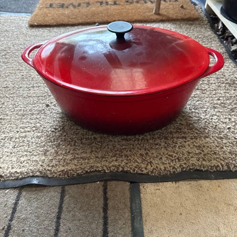 Rød fransk stegso i støbejern, måler 30*24*10 cm, har ingen fejl eller ridser.