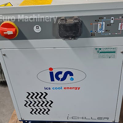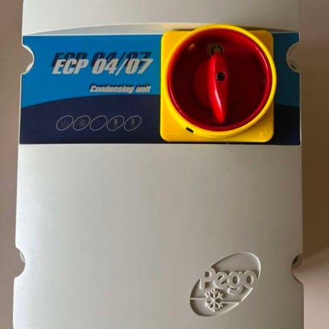 Estamos S-AQUACOOL 1000 køleenhed i gul farve. Enheden bruges til køling og har tilslutninger til væskekredsløb. Designet til at opretholde lave temperaturer i industrielle eller tekniske apparater.