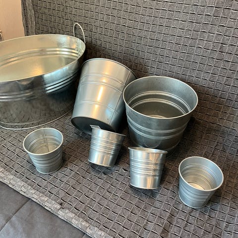 Zinkspande, nyere med hank, eventuelt til haven, havepynt, juledekoration, havepotter, urtepotte skjuler. Elforzinket spande.