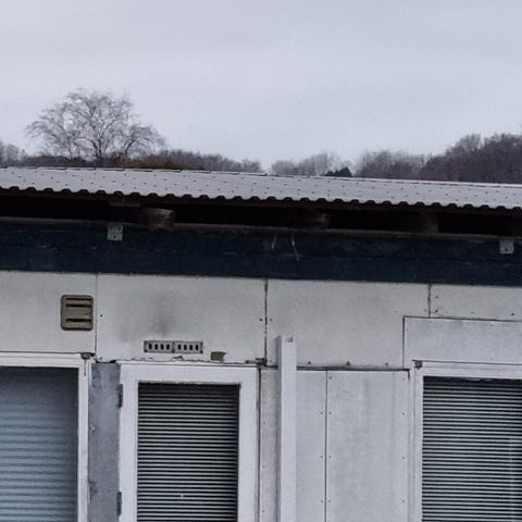De er beklædt med sort træ i enden Der kan følge beklædning med til den en side. Der er lagt stål tag på vognene så det lignede mere et hus. Træet er ikke skåret til.