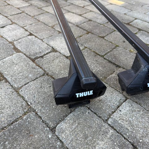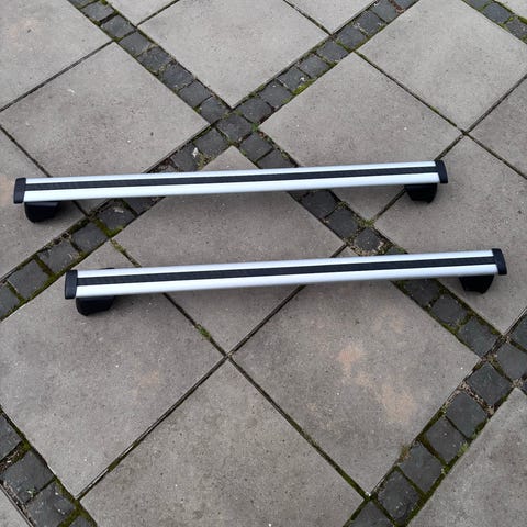 Thule tagbøjler i aluminium, designet til montering på biler for at transportere ekstra last som cykler, kufferter eller sportsudstyr. Bøjlerne er fremstillet i holdbart materiale og har et enkelt, funktionelt design.