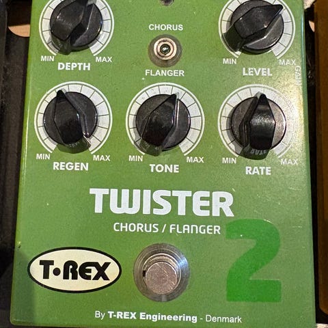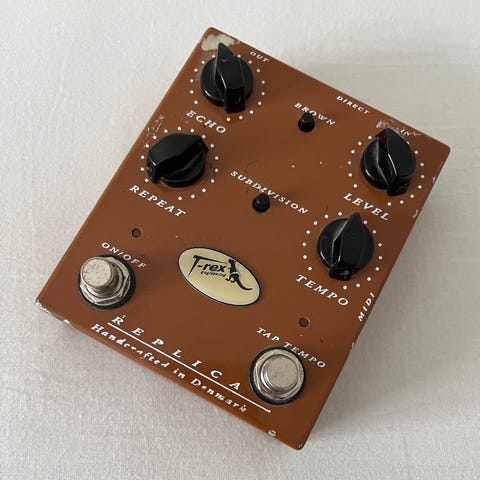 T-Rex Reptile Delay 2 guitarudstyr med kontrolknapper til Echo, Repeat, Level, Time, Flutter Tone, Speed, Width og Tempo. Lækker og anderledes lyd ift mere konventionelle delaypedaler pga mulighed for flutter.