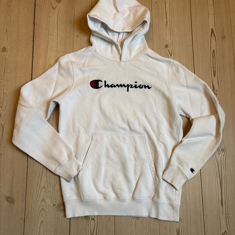 Pæn grå hoodie fra Champion og lakse farvet - lyserød t-shirt fra Vans med tryk på ryggen.