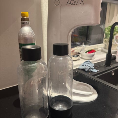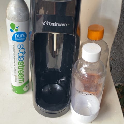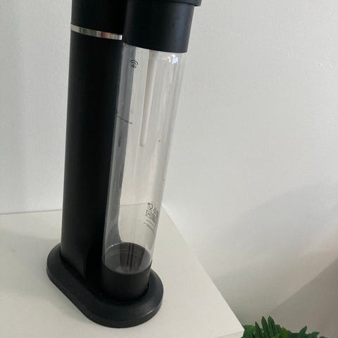 En flot sort sodastreamer (90 grader nord) med 2 stk. 0,8 liters flasker til og en ny ubrugt + en brugt kulsyrepatron til. En patron rækker til 60 liter soda/danskvand. Det hele er kun brugt ganske lidt. Det hele vejer 3,3 kg. Samlet nypris er 900 kr.. sælges til samlet pris + evt. Dao fragt.