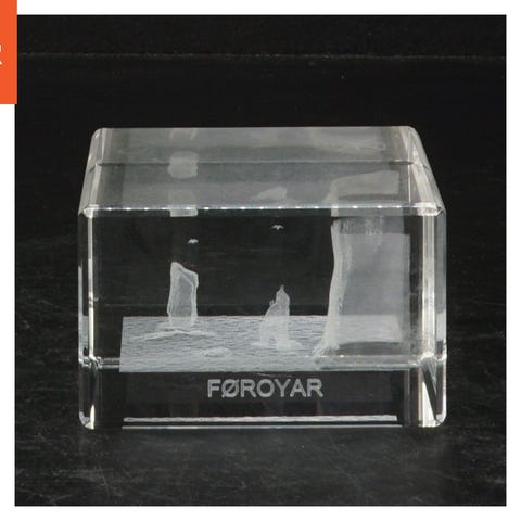 Firkantet glas skulptur med detaljeret design invendigt. Skulpturen portrættere Føroyar og kommer i pæn blå æske