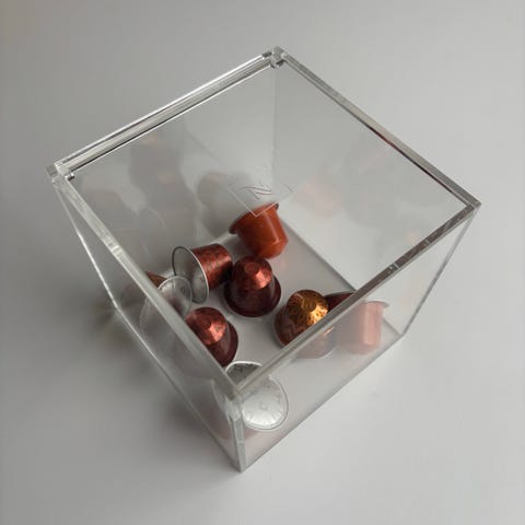 Opbevarings boks lavet af klar plastik. Boksen har en firkantet form og er velegnet til opbevaring af mindre genstande / lavet til Nepresso kaffe kapsler.