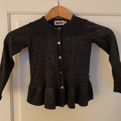 Mørkeblå cardigan i rib finstrik til de mindste. Denne cardigan er fremstillet i en blød cashmere/viskose blanding, har rund halsudskæring, lange ærmer, samt små knapper med perlemors finish