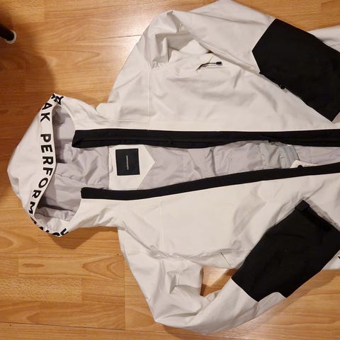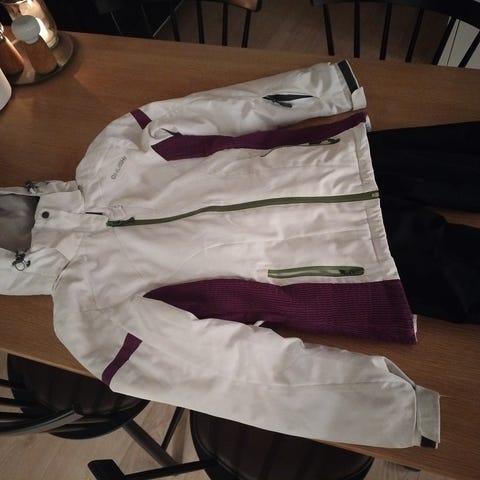 Dame ski- og vintertøj sæt i størrelse S, bestående af jakke og bukser i farverne hvid og sort. Sættet er designet til vinterbrug og sport, og er egnet til aktiviteter som skiløb eller anden vintersport.
